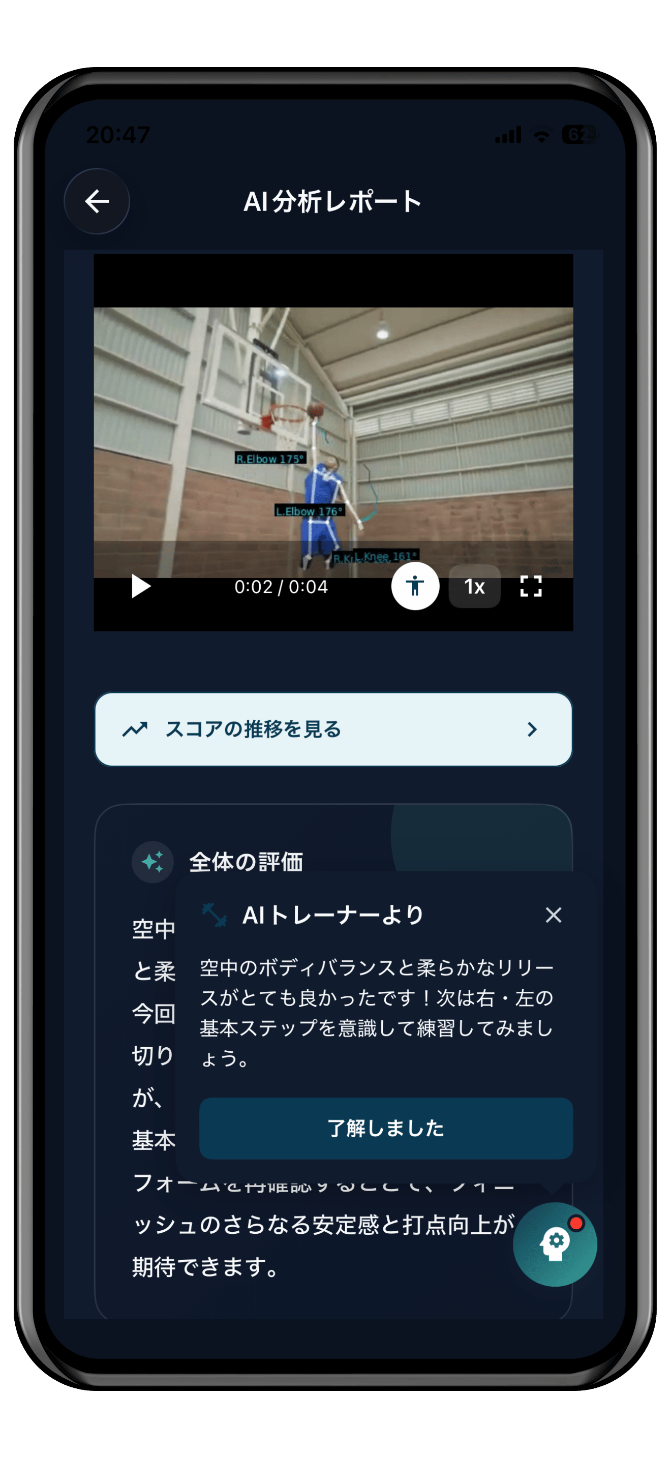 リリース角度、フォロースルー、着地バランス、重心移動をAIが数値化。ポジション別の理想フォームとの比較も可能です。